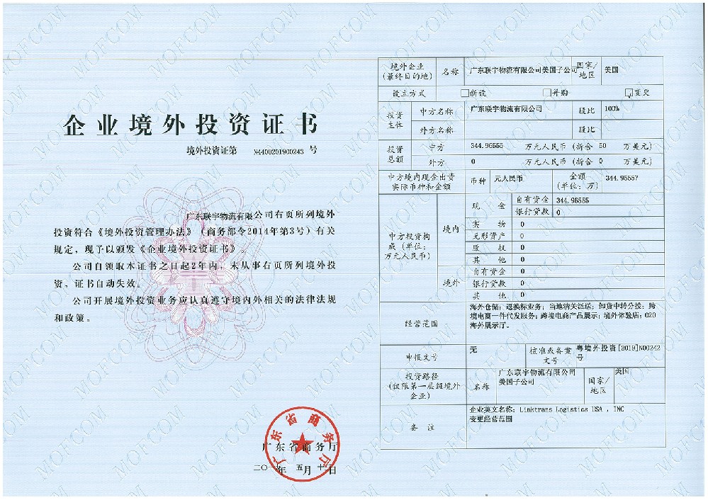 企業(yè)境外投資證書